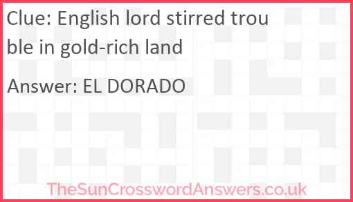 English lord stirred trouble in gold-rich land is a crossword clue for which we have 2 possible answer and we have spotted 2 times in our database. This crossword clue was last seen on 11 December 2020 in The Sun Cryptic Crossword puzzle!