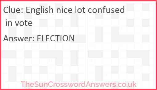 English nice lot confused in vote is a crossword clue for which we have 1 possible answer and we have spotted 2 times in our database. This crossword clue was last seen on 16 November 2024 in The Sun Cryptic Crossword puzzle!