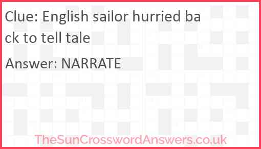 English sailor hurried back to tell tale is a crossword clue for which we have 1 possible answer and we have spotted 1 times in our database. This crossword clue was last seen on 17 September 2021 in The Sun Cryptic Crossword puzzle!