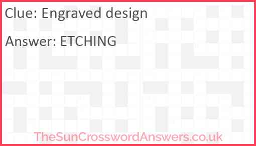 Engraved design is a crossword clue for which we have 1 possible answer and we have spotted 2 times in our database. This crossword clue was last seen on 07 September 2023 in The Sun Coffee Time Crossword puzzle!