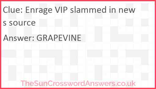 Enrage VIP slammed in news source is a crossword clue for which we have 1 possible answer and we have spotted 1 times in our database. This crossword clue was last seen on 01 February 2024 in The Sun Cryptic Crossword puzzle!