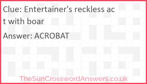 Entertainer's reckless act with boar is a crossword clue for which we have 1 possible answer and we have spotted 1 times in our database. This crossword clue was last seen on 21 June 2024 in The Sun Cryptic Crossword puzzle!
