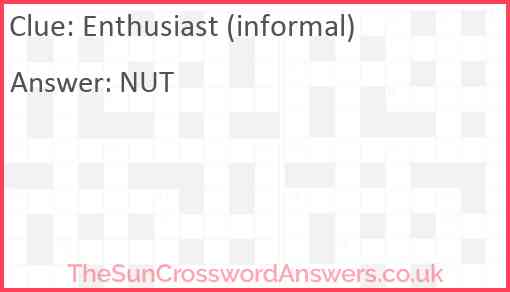 Enthusiast (informal) is a crossword clue for which we have 1 possible answer and we have spotted 1 times in our database. This crossword clue was last seen on 28 June 2019 in The Sun Coffee Time Crossword puzzle!