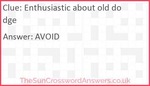 Enthusiastic about old dodge is a crossword clue for which we have 1 possible answer and we have spotted 3 times in our database. This crossword clue was last seen on 11 August 2023 in The Sun Cryptic Crossword puzzle!