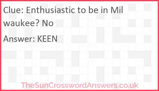 Enthusiastic to be in Milwaukee? No is a crossword clue for which we have 1 possible answer and we have spotted 1 times in our database. This crossword clue was last seen on 20 December 2023 in The Sun Cryptic Crossword puzzle!