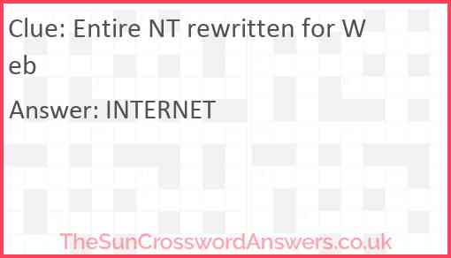 Entire NT rewritten for Web is a crossword clue for which we have 1 possible answer and we have spotted 1 times in our database. This crossword clue was last seen on 14 March 2025 in The Sun Cryptic Crossword puzzle!
