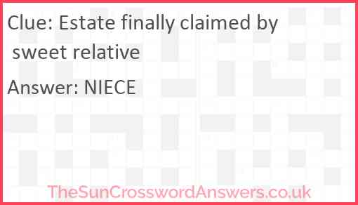 Estate finally claimed by sweet relative is a crossword clue for which we have 1 possible answer and we have spotted 3 times in our database. This crossword clue was last seen on 30 September 2022 in The Sun Cryptic Crossword puzzle!