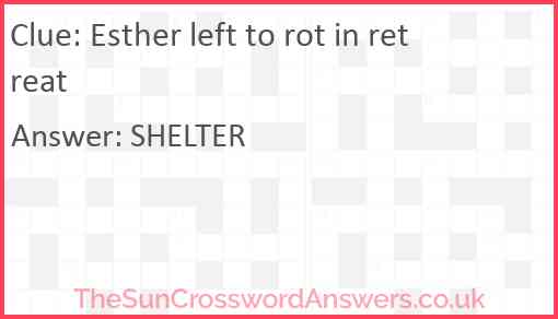 Esther left to rot in retreat is a crossword clue for which we have 1 possible answer and we have spotted 2 times in our database. This crossword clue was last seen on 28 January 2024 in The Sun Cryptic Crossword puzzle!