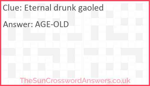 Eternal drunk gaoled is a crossword clue for which we have 2 possible answer and we have spotted 2 times in our database. This crossword clue was last seen on 16 February 2023 in The Sun Cryptic Crossword puzzle!