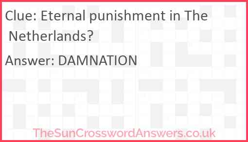 Eternal punishment in The Netherlands? is a crossword clue for which we have 1 possible answer and we have spotted 2 times in our database. This crossword clue was last seen on 09 December 2021 in The Sun Cryptic Crossword puzzle!