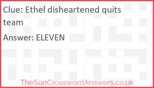 Ethel disheartened quits team is a crossword clue for which we have 1 possible answer and we have spotted 2 times in our database. This crossword clue was last seen on 04 January 2023 in The Sun Cryptic Crossword puzzle!
