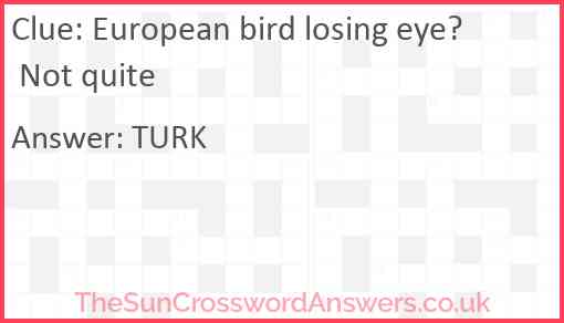 European bird losing eye? Not quite is a crossword clue for which we have 1 possible answer and we have spotted 1 times in our database. This crossword clue was last seen on 27 November 2023 in The Sun Cryptic Crossword puzzle!
