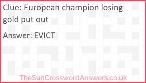 European champion losing gold put out is a crossword clue for which we have 1 possible answer and we have spotted 1 times in our database. This crossword clue was last seen on 14 September 2022 in The Sun Cryptic Crossword puzzle!