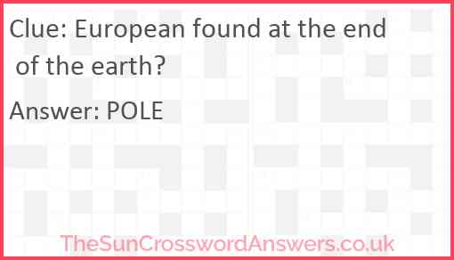 European found at the end of the earth? is a crossword clue for which we have 1 possible answer and we have spotted 2 times in our database. This crossword clue was last seen on 23 May 2025 in The Sun Cryptic Crossword puzzle!