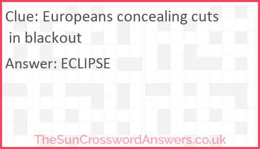 Europeans concealing cuts in blackout is a crossword clue for which we have 1 possible answer and we have spotted 3 times in our database. This crossword clue was last seen on 17 April 2025 in The Sun Cryptic Crossword puzzle!