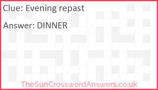 Evening repast is a crossword clue for which we have 2 possible answer and we have spotted 9 times in our database. This crossword clue was last seen on 12 August 2024 in The Sun Coffee Time Crossword puzzle!