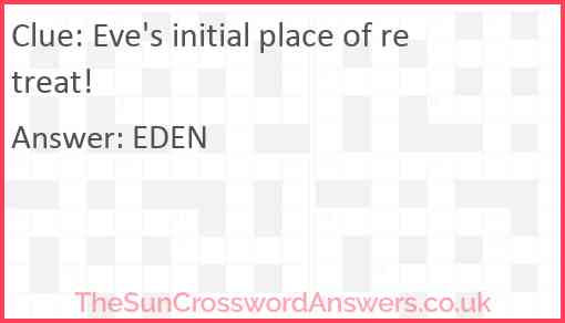 Eve's initial place of retreat? is a crossword clue for which we have 1 possible answer and we have spotted 3 times in our database. This crossword clue was last seen on 30 November 2022 in The Sun Cryptic Crossword puzzle!