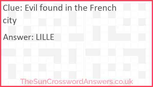 Evil found in the French city is a crossword clue for which we have 1 possible answer and we have spotted 3 times in our database. This crossword clue was last seen on 04 April 2025 in The Sun Cryptic Crossword puzzle!