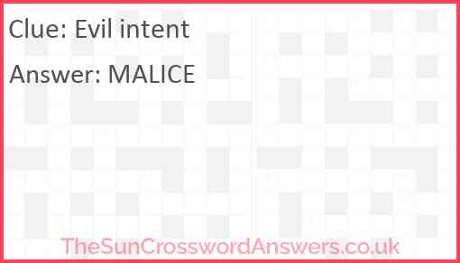 Evil intent is a crossword clue for which we have 1 possible answer and we have spotted 1 times in our database. This crossword clue was last seen on 21 April 2021 in The Sun Coffee Time Crossword puzzle!