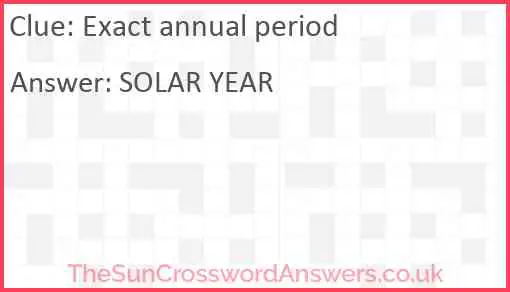 Exact annual period is a crossword clue for which we have 2 possible answer and we have spotted 2 times in our database. This crossword clue was last seen on 31 March 2023 in The Sun Coffee Time Crossword puzzle!