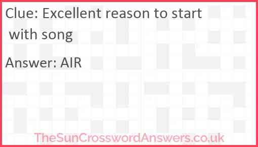 Excellent reason to start with song is a crossword clue for which we have 1 possible answer and we have spotted 3 times in our database. This crossword clue was last seen on 05 May 2024 in The Sun Cryptic Crossword puzzle!