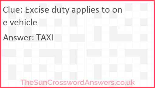 Excise duty applies to one vehicle is a crossword clue for which we have 1 possible answer and we have spotted 3 times in our database. This crossword clue was last seen on 16 May 2025 in The Sun Cryptic Crossword puzzle!