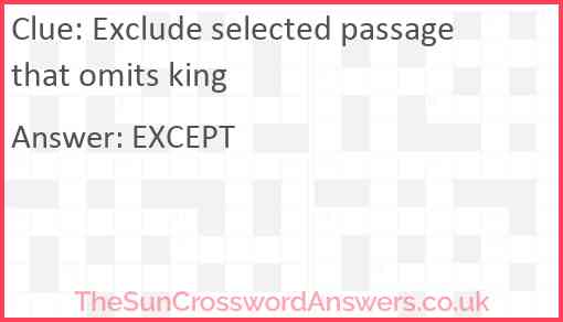 Exclude selected passage that omits king is a crossword clue for which we have 1 possible answer and we have spotted 1 times in our database. This crossword clue was last seen on 05 May 2023 in The Sun Cryptic Crossword puzzle!