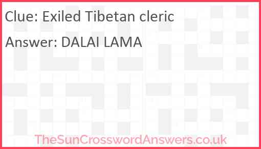 Exiled Tibetan cleric is a crossword clue for which we have 2 possible answer and we have spotted 9 times in our database. This crossword clue was last seen on 12 October 2024 in The Sun Coffee Time Crossword puzzle!