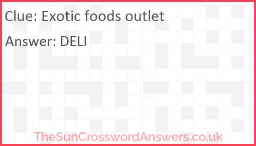 Exotic foods outlet is a crossword clue for which we have 1 possible answer and we have spotted 9 times in our database. This crossword clue was last seen on 30 August 2023 in The Sun Coffee Time Crossword puzzle!