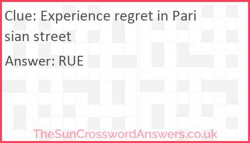 Experience regret in Parisian street is a crossword clue for which we have 1 possible answer and we have spotted 4 times in our database. This crossword clue was last seen on 30 November 2024 in The Sun Cryptic Crossword puzzle!