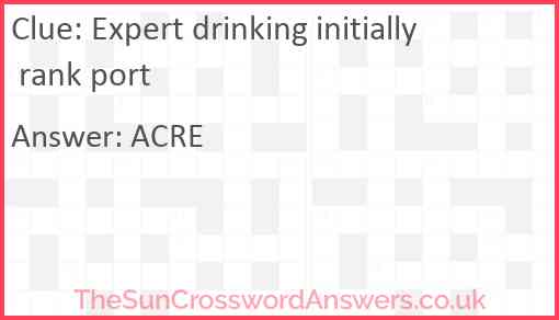 Expert drinking initially rank port is a crossword clue for which we have 1 possible answer and we have spotted 1 times in our database. This crossword clue was last seen on 04 August 2024 in The Sun Cryptic Crossword puzzle!