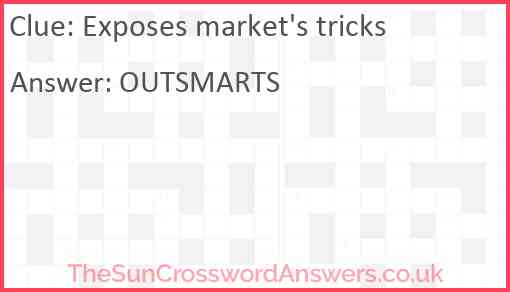 Exposes market's tricks is a crossword clue for which we have 1 possible answer and we have spotted 2 times in our database. This crossword clue was last seen on 18 November 2023 in The Sun Cryptic Crossword puzzle!