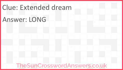 Extended dream is a crossword clue for which we have 1 possible answer and we have spotted 3 times in our database. This crossword clue was last seen on 21 June 2022 in The Sun Cryptic Crossword puzzle!
