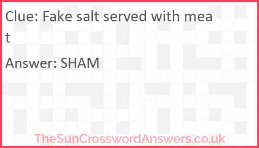 Fake salt served with meat is a crossword clue for which we have 1 possible answer and we have spotted 4 times in our database. This crossword clue was last seen on 12 January 2025 in The Sun Cryptic Crossword puzzle!
