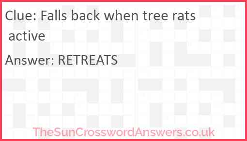 Falls back when tree rats active is a crossword clue for which we have 1 possible answer and we have spotted 1 times in our database. This crossword clue was last seen on 07 March 2022 in The Sun Cryptic Crossword puzzle!