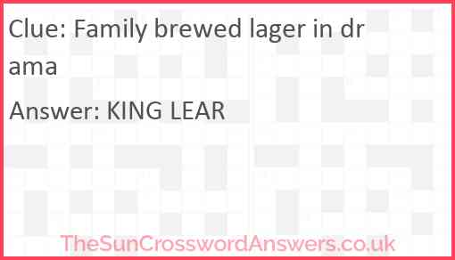 Family brewed lager in drama is a crossword clue for which we have 2 possible answer and we have spotted 2 times in our database. This crossword clue was last seen on 27 January 2023 in The Sun Cryptic Crossword puzzle!