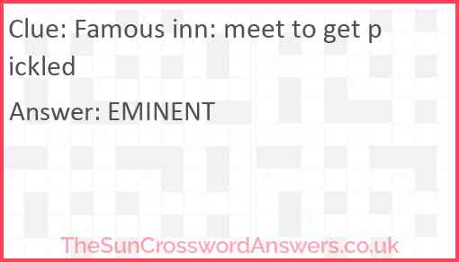 Famous inn: meet to get pickled is a crossword clue for which we have 1 possible answer and we have spotted 2 times in our database. This crossword clue was last seen on 12 August 2023 in The Sun Cryptic Crossword puzzle!