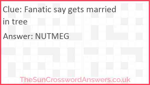 Fanatic say gets married in tree is a crossword clue for which we have 1 possible answer and we have spotted 2 times in our database. This crossword clue was last seen on 16 December 2024 in The Sun Cryptic Crossword puzzle!