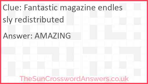 Fantastic magazine endlessly redistributed is a crossword clue for which we have 1 possible answer and we have spotted 2 times in our database. This crossword clue was last seen on 25 July 2025 in The Sun Cryptic Crossword puzzle!