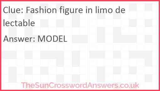 Fashion figure in limo delectable is a crossword clue for which we have 1 possible answer and we have spotted 2 times in our database. This crossword clue was last seen on 14 January 2022 in The Sun Cryptic Crossword puzzle!