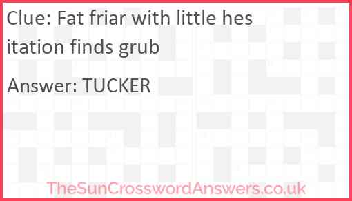 Fat friar with little hesitation finds grub is a crossword clue for which we have 1 possible answer and we have spotted 1 times in our database. This crossword clue was last seen on 15 August 2023 in The Sun Cryptic Crossword puzzle!