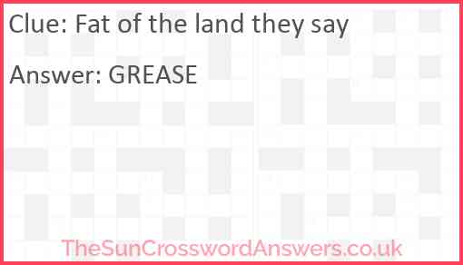 Fat of the land they say is a crossword clue for which we have 1 possible answer and we have spotted 3 times in our database. This crossword clue was last seen on 07 February 2025 in The Sun Cryptic Crossword puzzle!