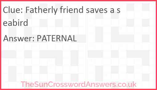 Fatherly friend saves a seabird is a crossword clue for which we have 1 possible answer and we have spotted 1 times in our database. This crossword clue was last seen on 28 August 2024 in The Sun Cryptic Crossword puzzle!