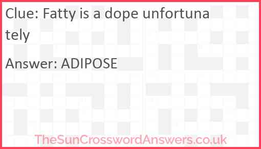 Fatty is a dope unfortunately is a crossword clue for which we have 1 possible answer and we have spotted 2 times in our database. This crossword clue was last seen on 17 June 2024 in The Sun Cryptic Crossword puzzle!