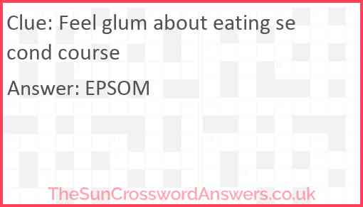 Feel glum about eating second course is a crossword clue for which we have 1 possible answer and we have spotted 1 times in our database. This crossword clue was last seen on 31 October 2021 in The Sun Cryptic Crossword puzzle!
