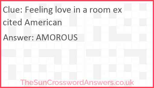 Feeling love in a room excited American is a crossword clue for which we have 1 possible answer and we have spotted 1 times in our database. This crossword clue was last seen on 14 September 2024 in The Sun Cryptic Crossword puzzle!