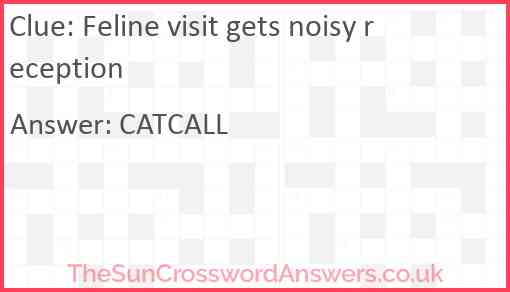 Feline visit gets noisy reception is a crossword clue for which we have 1 possible answer and we have spotted 3 times in our database. This crossword clue was last seen on 04 January 2024 in The Sun Cryptic Crossword puzzle!