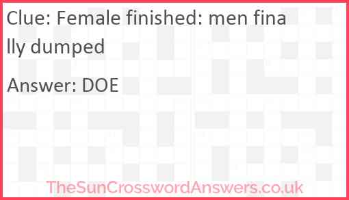 Female finished: men finally dumped is a crossword clue for which we have 1 possible answer and we have spotted 2 times in our database. This crossword clue was last seen on 26 July 2025 in The Sun Cryptic Crossword puzzle!