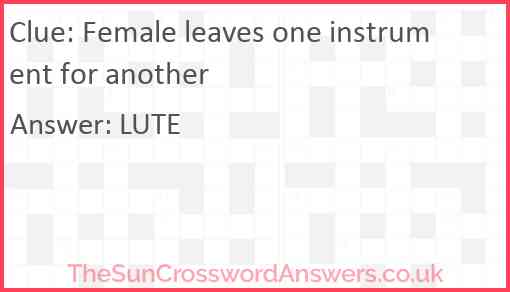 Female leaves one instrument for another is a crossword clue for which we have 1 possible answer and we have spotted 3 times in our database. This crossword clue was last seen on 30 September 2023 in The Sun Cryptic Crossword puzzle!