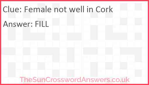 Female not well in Cork is a crossword clue for which we have 1 possible answer and we have spotted 1 times in our database. This crossword clue was last seen on 25 November 2024 in The Sun Cryptic Crossword puzzle!